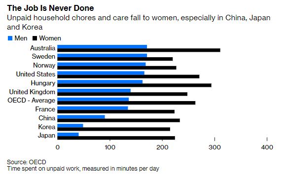 Det är ju en klart att kvinnor gör mer av det obetalda arbetet hemma i de presenterade länderna. Det som fick mig att hoppa till var dock att vi i Sverige läger nästan dubbelt så mycket tid som personer i Japan på obetalt arbete i hemmet. I Sverige lägger vi männen ca 171 min och kvinnorna 220 min, medans i Japan lägger männen ca 40 min och kvinnorna 224, det blir en skillnad på 127 min OM DAGEN. Har vi verkligen så mycket mer att göra i Sverige att det motiverar 2h mer arbete varje dag? Är inte det något av det största slöseriet ni har hört på länge? Att vi lägger nästan en hel arbetsdag där hemma efter jobbet känns mycket för mig.