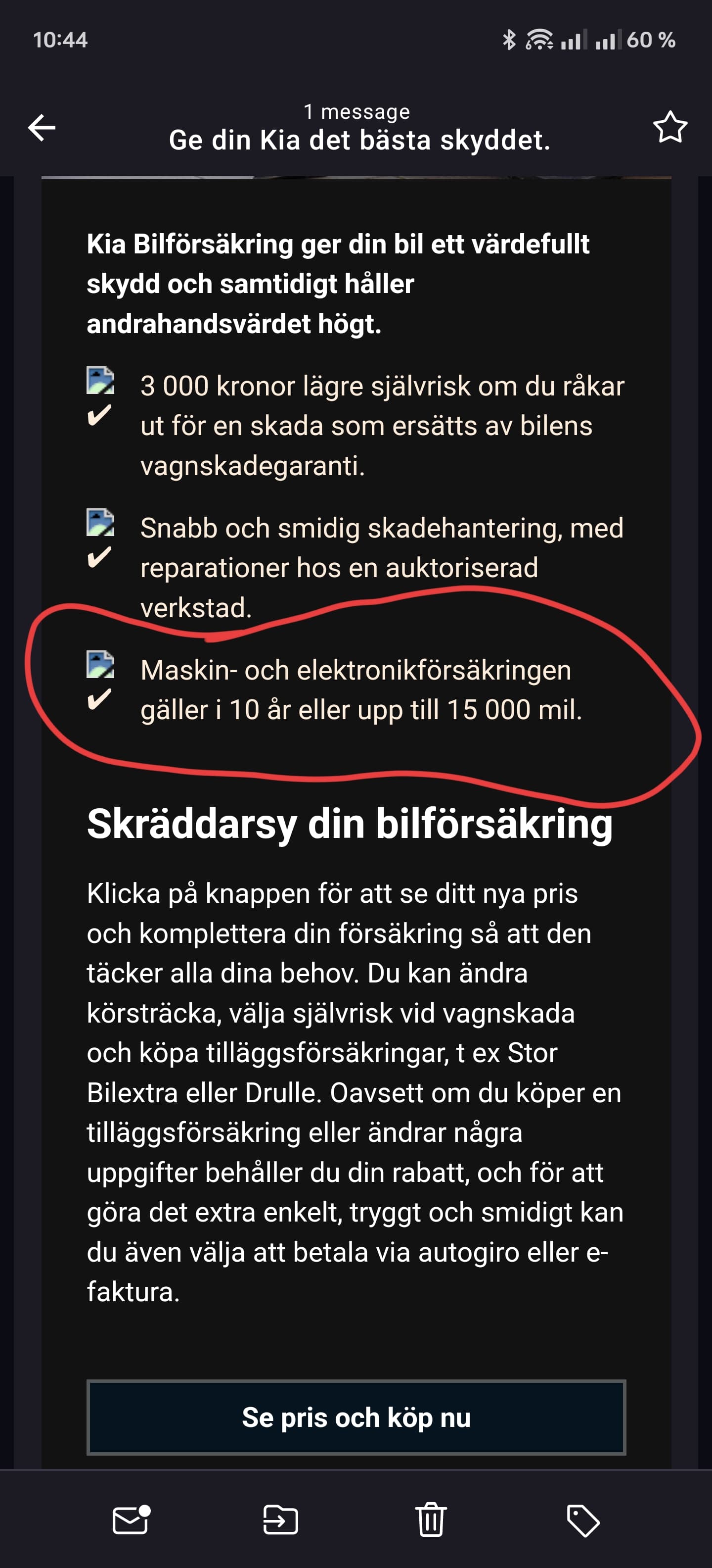 Kollade lite försäkringar. Hos LF kan jag få helförsäkring för 1800kr. Kias egna med rulla ut rabatt går på 4500kr. Dock står det i mejlet lite konstigt formulerat. Gäller enbart 7år/15000 mil garanti med deras egna försäkring?!