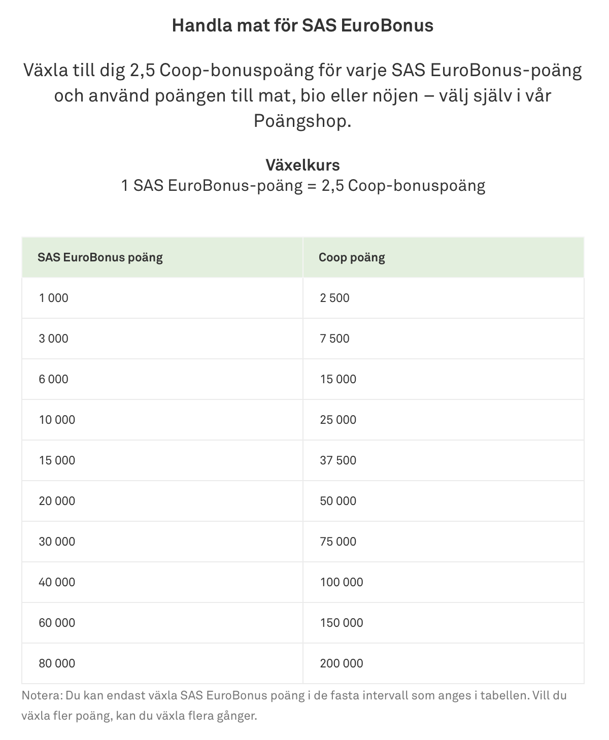 Och tillägget om man handlar på Coop och konverterar deras poäng till SAS poäng när Coop har kampanjer för detta så betalar man endast 8 öre per poäng!