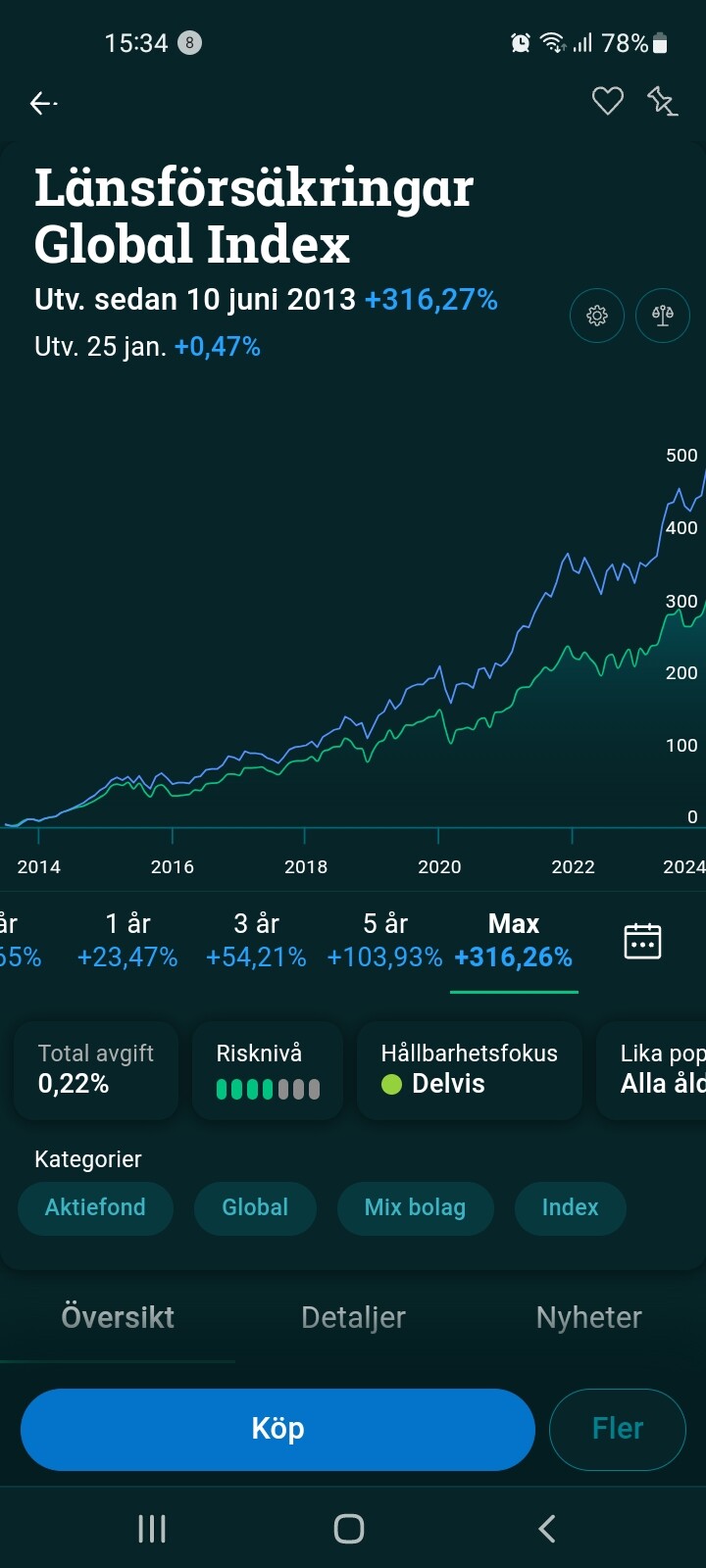 Har själv 40% i lysa hållbar. För att göra det enkelt. Förresten först vill jag påpeka att deras förslag inte var fel. Bara sämre än vad jag körde. Klassikern här är och säga allt i länsförsäkringar global. Eller 80% lfg och 20% Sverige osv. När jag var mer osäker 4 år sedan så var svaret alltid det jag nämnde. När jag själv blev medlem här och föreslog amf aktiefond Nordamerika. Var det samma svar. Allt i global osv. Historisk avkastning ingen garanti etc. Så klart sant det sistnämnda. Men hade jag lyssnat på det hade jag tjänat minst 60% mindre idag om jag skippade Nordamerika osv.