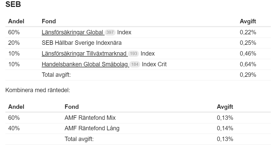 Håller med. Är man som TS bara 39 år så känns räntefonder väl konservativt. 85/15 global/sverige eller liknande räcker gott och väl. Vill man spicea till det lite kan en del av Sverige-delen vara en småbolagsfond (om det är kollektivavtalad tjänstepension så att fondavgiften är billig).