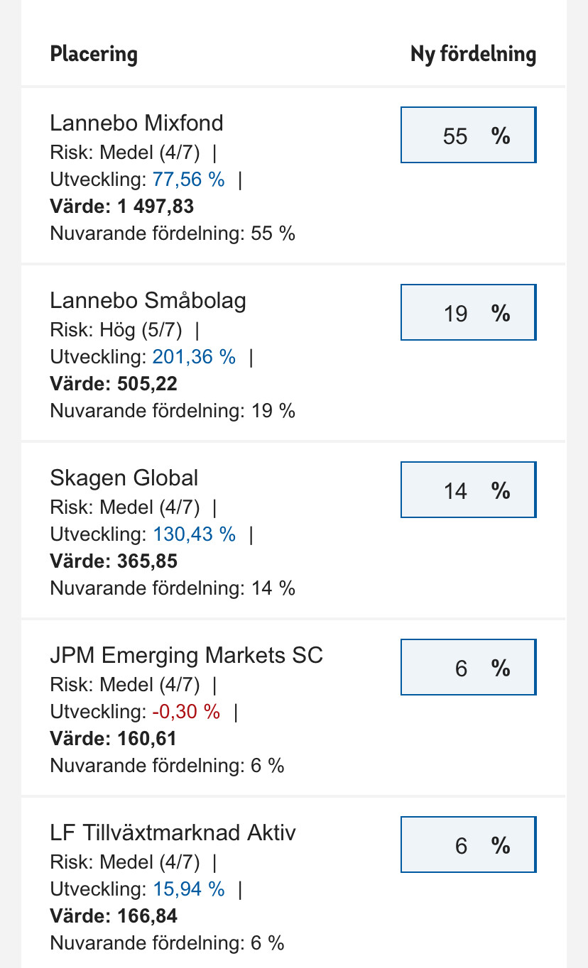 Märkte idag att jag har en liten summa tjänstepension som tydligen ligger på Länsförsäkringar (gammalt jobb 2011) där utveckligen inte ser bra ut alls. Antagligen pga att det mesta ligger i aktivt förvaltade fonder med hög avgift som äter upp utvecklingen. Sattes in 3400:- 2011 och idag är värdet bara 2900:- vilket känns kasst! Fonderna har ju gått upp men mitt värde har bara minskat