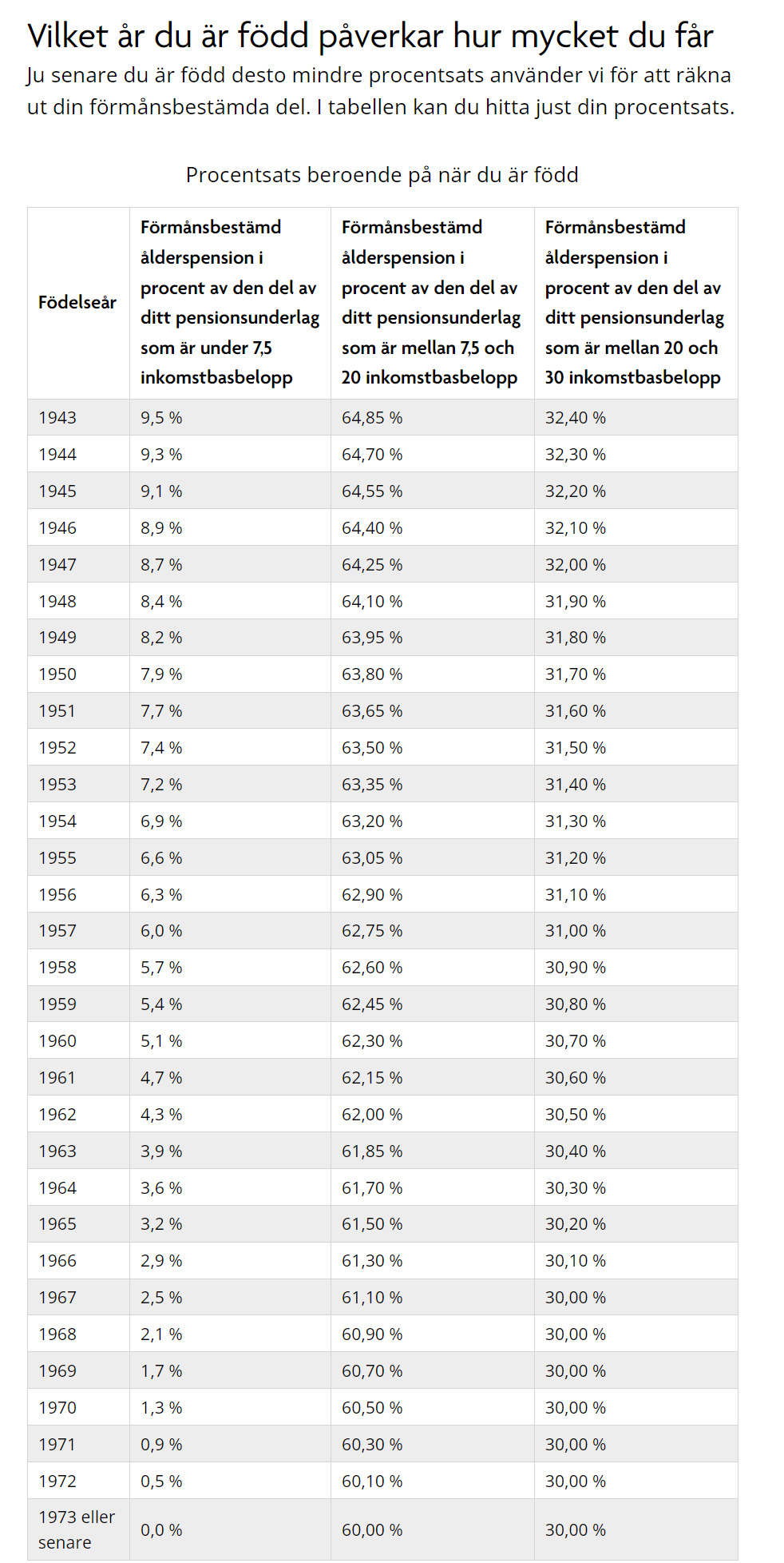 Kan bara hålla med om att den förmånsbestämda delen av den statliga tjänstepensionen är bra. Gick i pension förra året vid 62,5 års ålder och maxar, som man kan välja att göra, den pensionen innan 65, vilket ensam (tar inte ut någon annan pension innan 65) ger mig en pension strax under brytpunkten för statlig skatt. Nackdelen med att göra det är högre skatt innan riktåldern och att den pensionen, som är livsvarig, blir lägre efter 65. Men jag behöver då ha "oturen att bli typ 93 innan jag går back på att maxa den innan 65 och det kan jag verkligen ta. Den pensionen räknas dessutom upp med inflationen så den höjdes nästa 10 procent från och med 2024. Är egentligen inte särskilt beroende av pension men det känns bra att minska risken för att den delvis brinner inne om jag inte har “oturen” att uppnå nära tresiffrig ålder!