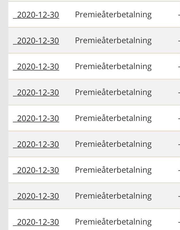 Sedan ser jag i december 2020 att 9 insättningar dragits tillbaka på ITPKn. Jag har varken fått någon förklaring eller att någon visat att det just var 9 inbetalningar för mycket. Dessutom är återbetalningen något högre än de premier som gått in. Återigen utan någon förklaring.