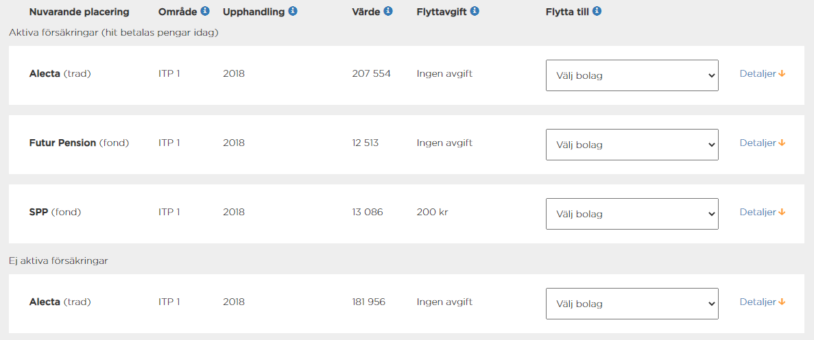 Från “Ej aktiva försäkringar” går det att flytta in i alla (inkl. SPP eller Futur).