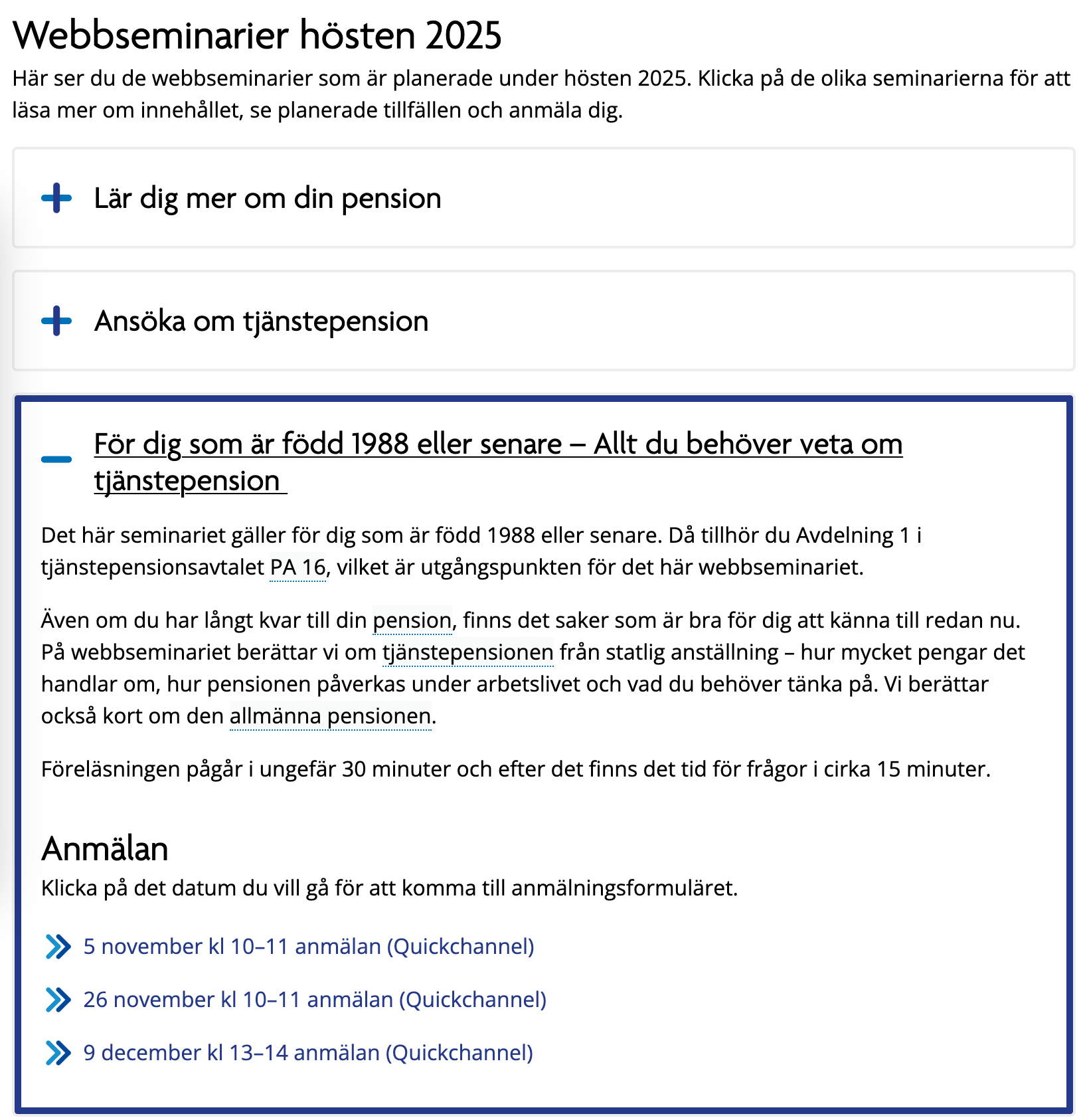 Du kanske kan testa att kolla på SPV’s webbseminarier nu i höst. Anmälan görs på den här sidan, där du får trycka på + knappen för att expandera menyn “För dig som är född 1988 eller senare - Allt du behöver veta om tjänstepension”.