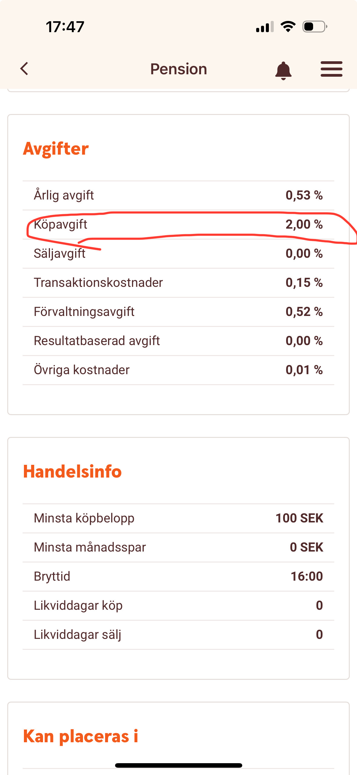 Jag tillhör KAP-KL och har Tjänstpension i Swedbank. Valde just Swedbank Robur Globalfond I, avgift är 0.52% men det finns köpavgift på 2% som jag inte visst från början. Så det verkar inte så förmånligt som du nämnde eller jag har missat något ?