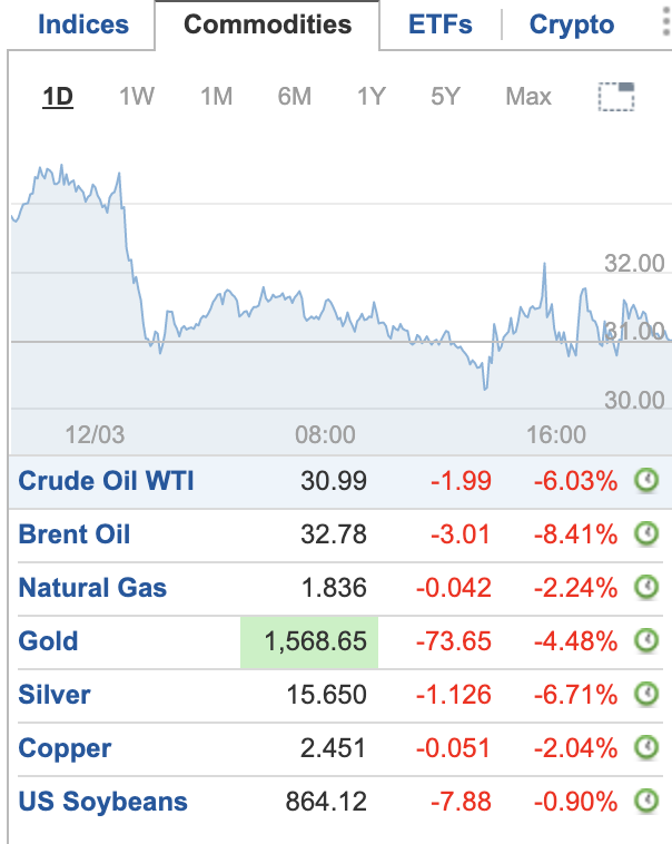 Nja, man ska nog inte räkna in guld. När börsen kraschar faller allt, även guld. Här är ett exempel från den 12 mars förra året då börsen föll med över 10 %.