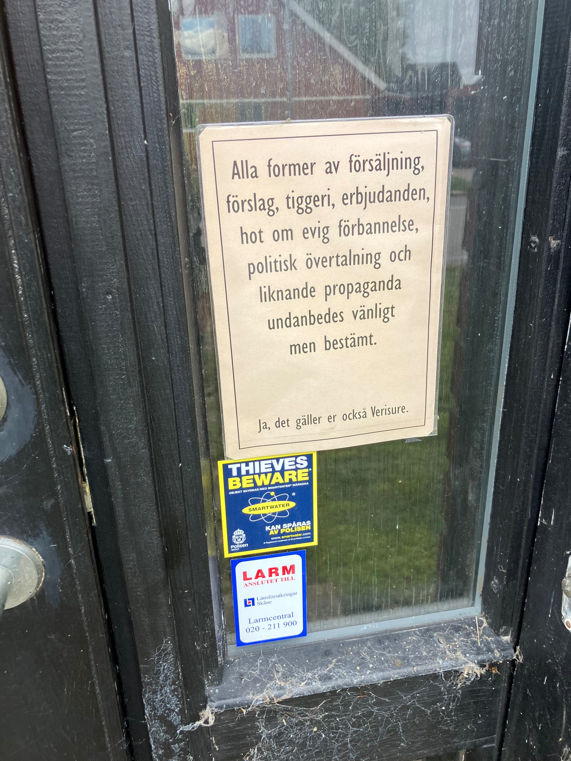 Öppnade dörren, såg dem. Sa “Sitter i jobbmöte, inte intresserad” och stängde dörren. De hann inte reagera. Just då brydde jag mig inte om jag var ohövlig eller inte.