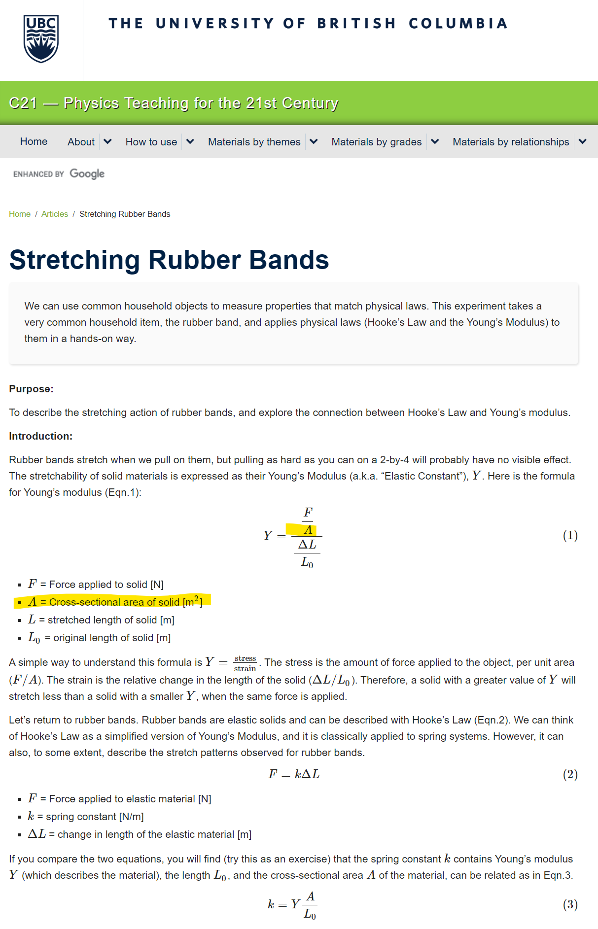 Om du drar gummit 5 cm med handen så kan det ge olika töjningar mellan ett smalt och brett band. Därför kan motståndet vara olinjärt vs tvärsnittsarean.