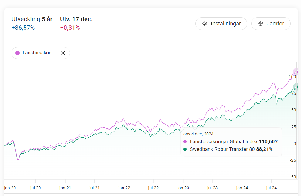 Hur ser avkastningen ut historiskt för Transfer 80 jämfört med t.ex. LF Global index? Har du fått något för den otroligt dyra avgiften historiskt jämfört med alternativen som är billigare och har haft mycket högre avkastning?