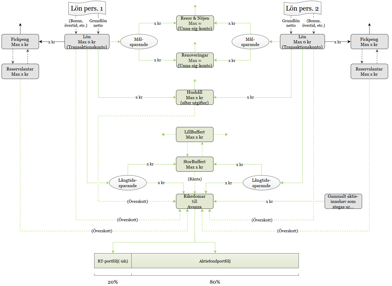 Alltså, på lönedagen har man sin lön + flex-pengarna på lönekontot, allt annat överför man till sparandet. Helt enkelt: