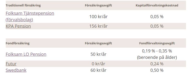 Känns som det fanns väldigt få alternativ här, jämfört med vad jag sett olika avtal erbjuda. Fondförvaltningsavgiften som redovisas är för respektives bolags entrelösning, dvs den generationsfond alla automatiskt hamnar i. Men oftast kan du själv välja egna fonder istället för entrelösningen och på så sätt få ner denna avgift ytterligare.