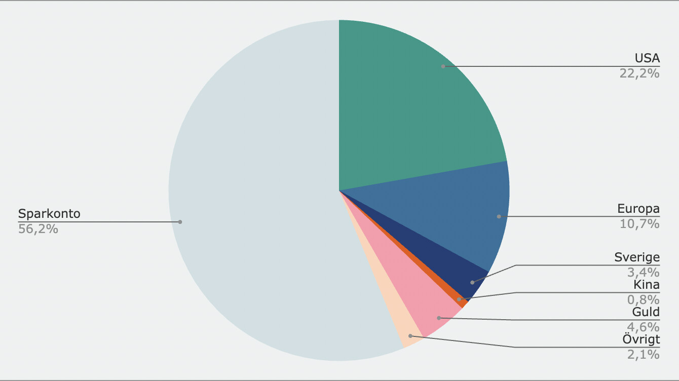 Så här ser min fördelning ut. 50% av värdepapper, 22,2% av likvida medel. Jag har nog en ovanligt stor andel, mer än hälften, av likvida medel på sparkonto.