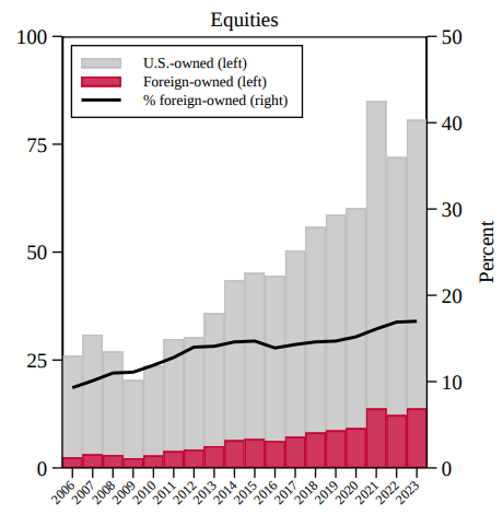 Om jag har tolkat det rätt så ägs ca 83% av aktiemarknaden i USA av amerikaner och bara 17% av utländska innehavare. Det var mycket mindre än vad jag trodde.