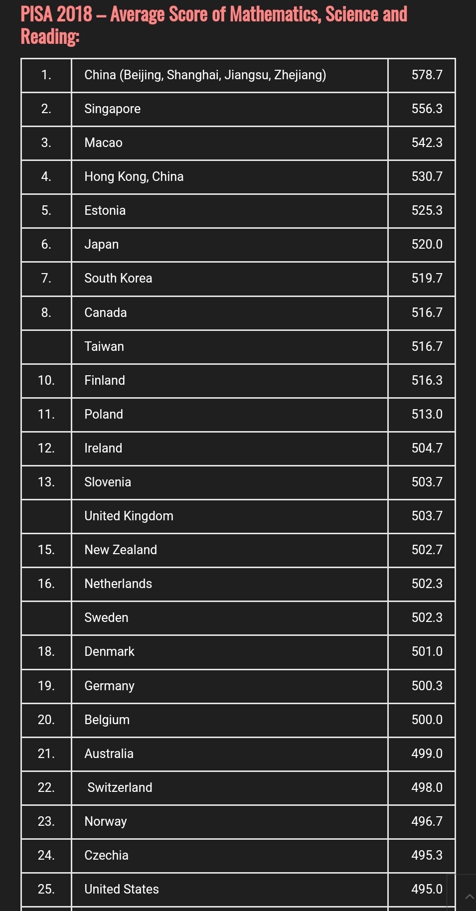 (Sveriges poäng något dopat av fusk med resultaten från nyinvandrade. Gissar att liknande skulle kunna gälla även Tyskland, och kanske nåt mer land med överdriven politisk korrekthet.)