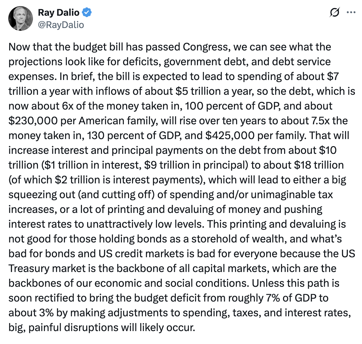 Enligt Ray Dalio väntas skulden per familj väntas öka från $230,000 (idag) till $425,000 (om tio år) och räntekostnaderna från skulden väntas gå från $1T (idag) till $2T (om tio år). Han varnar även för amerikanska obligationer och makroekonomin i stort p.g.a. ryggraden i ekonomin försvagas.