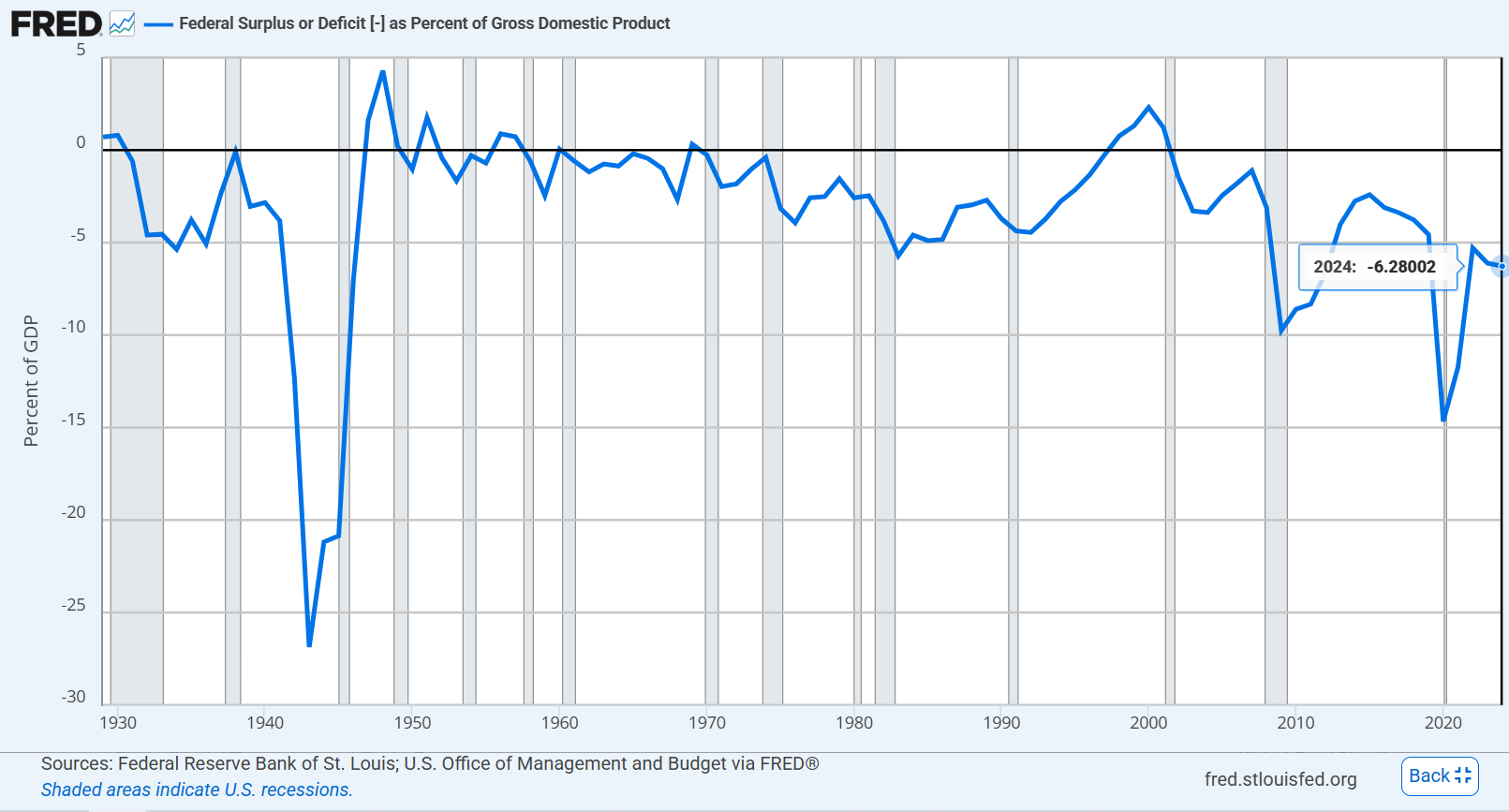 Här är ett annat intressant nyckeltal: Statsbudgetens över-/underskott som andel av BNP. 2024 var underskottet ca. 6,3% för USA.