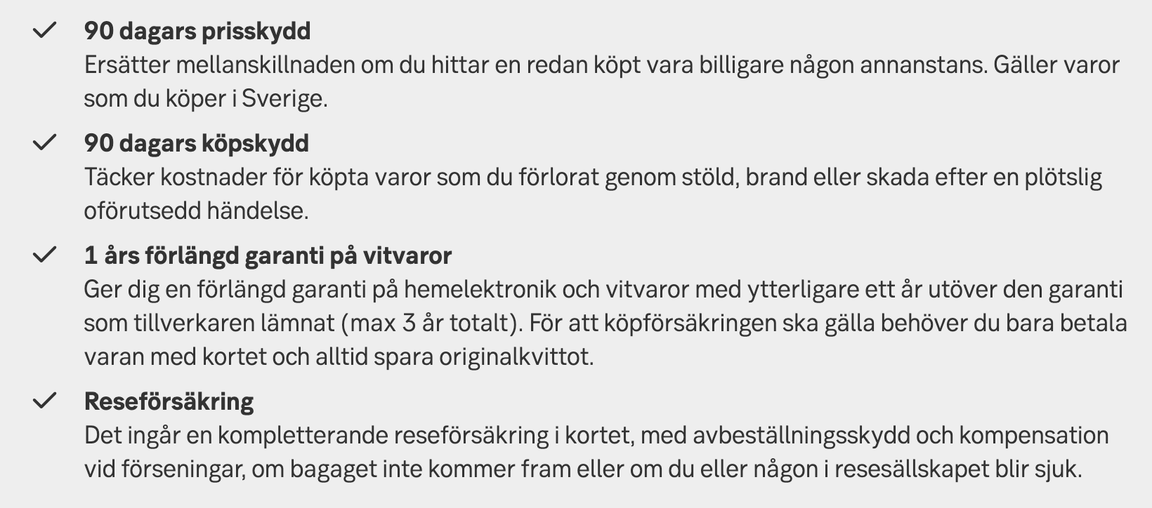 Fördelar: Gratis uttag i bankomat, Reseförsäkring inkluderad, Räntefritt om fakturan betalas i tid, Apple Pay, Google Pay, flygpoäng.