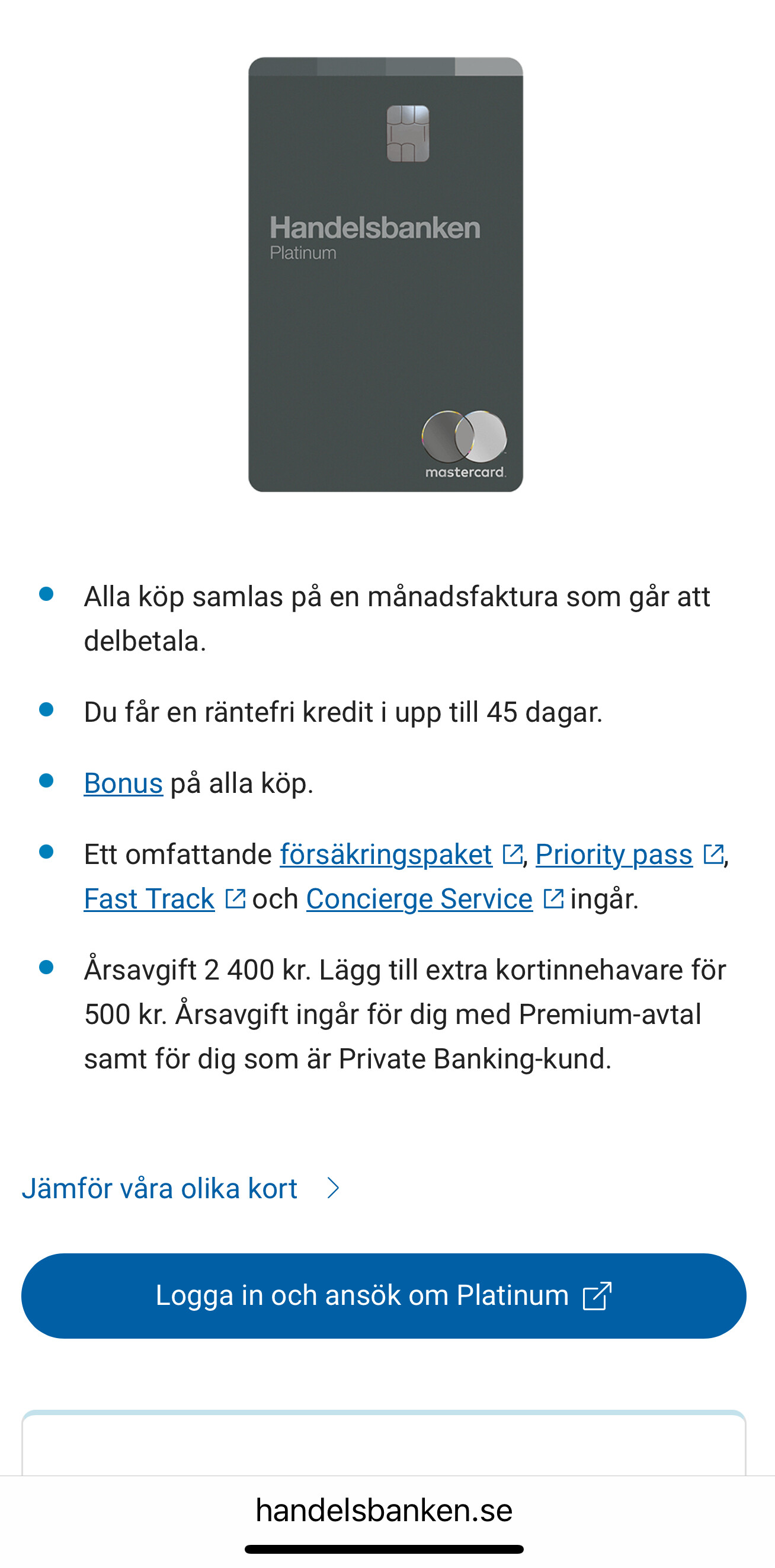 Tycker Handelsbankens Platinum är bra, bytte till det efter många år med SAS Mastercard.