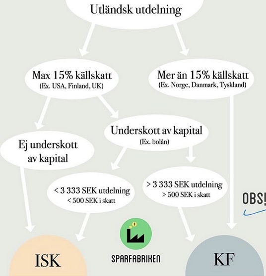 - Äger man aktierna direkt dras 15% källskatt på utdelningar innan du får dem, som sedan räknas av automatiskt av Skatteverket (upp till schablonintäken)/utställaren av KF:en.