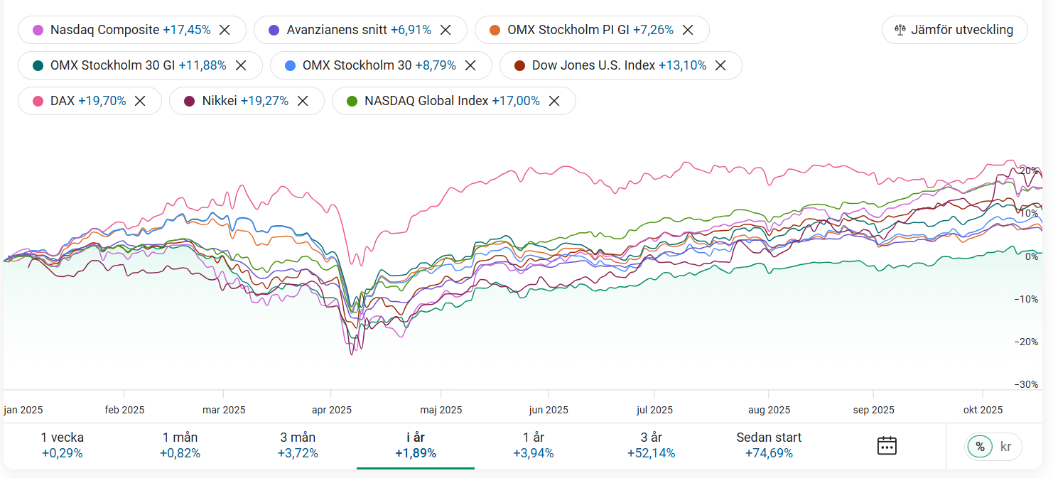 Är en gammal medlem i forumet som tidigare lagt en stor del av äggen Länsförsäkringar Global Index. Bytte för något snart 2 år sen till DNB Global Indeks S (70% investerat) och är lite fundersam över utvecklingen i år. Fonden rekommenderas och är säkert bra men vid jämförelse känns det som att portföljen halkar efter? Som komplement i portföljen har jag plus alla bolag sverige (20%) och avanza emerging markets (10%). Utveckling i år ligger relativt lågt som ni ser nedan. Hur ser det ut för er i år?