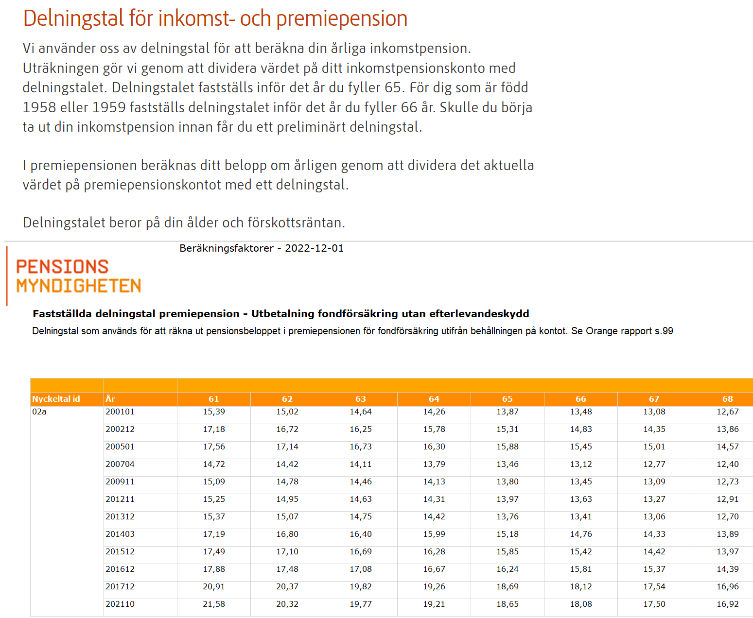 Inom AKAP-KR är livslångt uttag standard, men du kan även välja andra perioder. Kortast period är 10 år. Om du har tidsbestämd så används inte delningstal. Vissa tar tex och delar tiden i antal månader, tex min Swedbank jag tar ut på 5 år får jag 1/60-del första månaden, 2/59-del andra månaden etc. Medan min traditionella från Folksam på 5 år fastställs årligen.