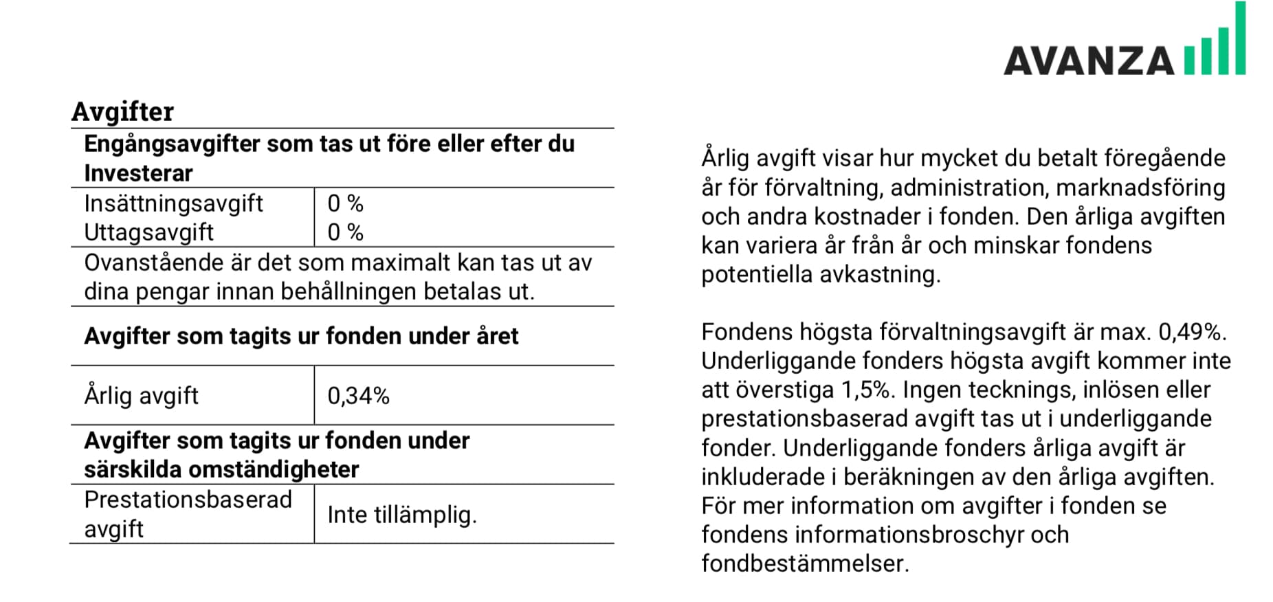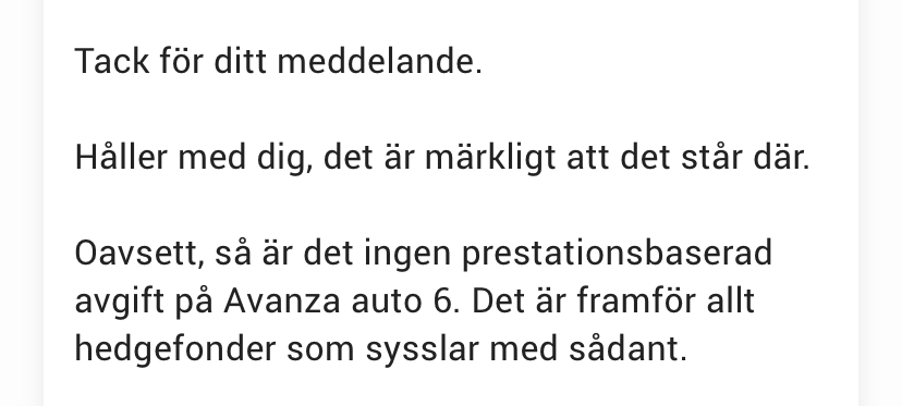 Om fonden slår jämförelse index då blir det extra avg. Det finns någon anlädning att de vill ha extra pengar. Lysa är billigare och inga extra avg. Du får ringa Avanza