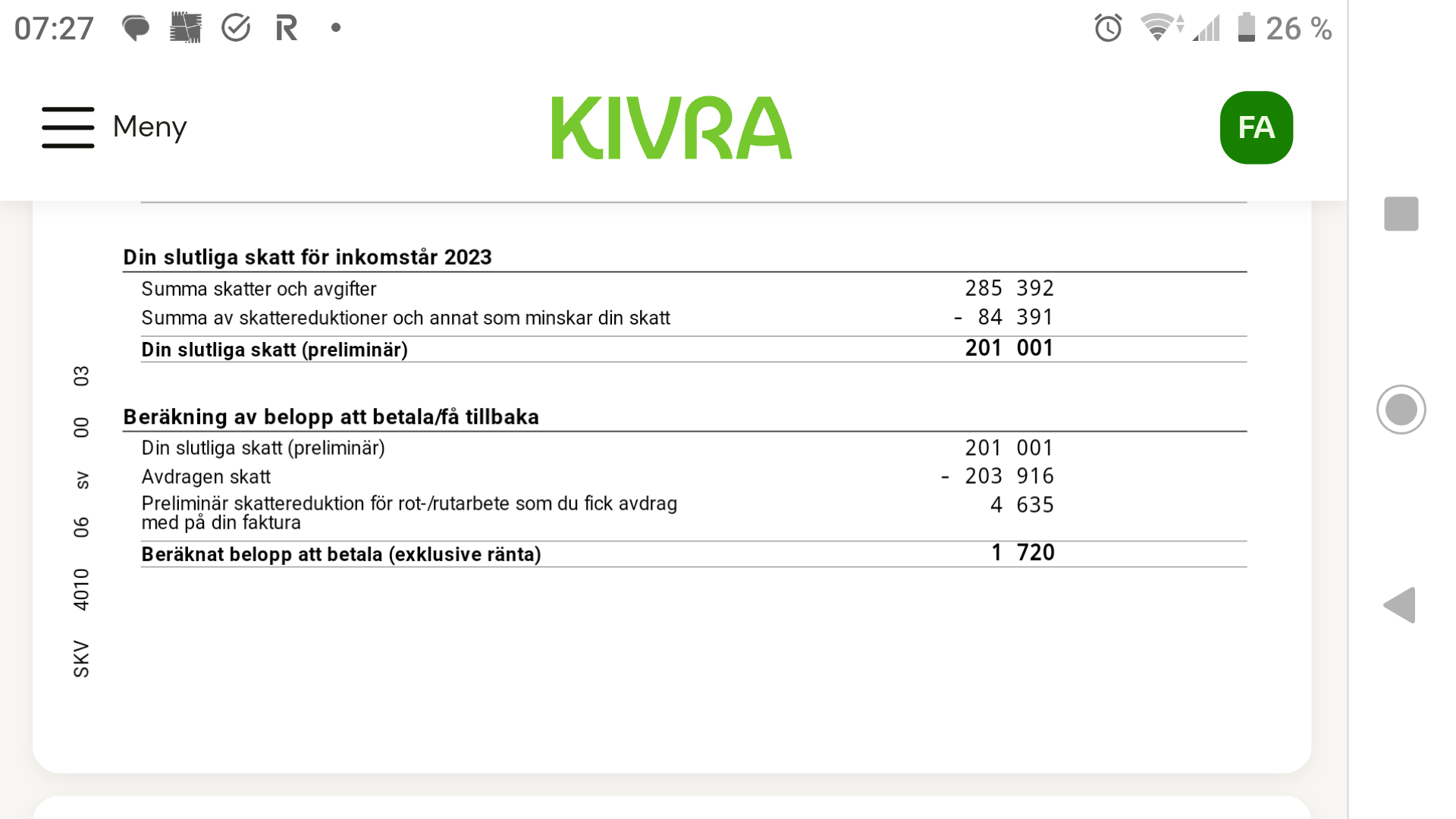 Felet är att du inte har betalat tillräckligt med preliminärskatt. Det är därför du får kvarskatt. Hade du fått 24 635 i skattereduktion för ROT så hade det dragits av i din slutliga skatt som hade varit 181 000 kr. Avdragen skatt hade varit den samma (203 916) men 24 635 (som hantverkaren har fått utbetalt från Skatteverket) hade lagts till i preliminär skattereduktion (i stället för 4 635) och beräknat belopp att betala hade varit exakt det samma: 1 720 kr.