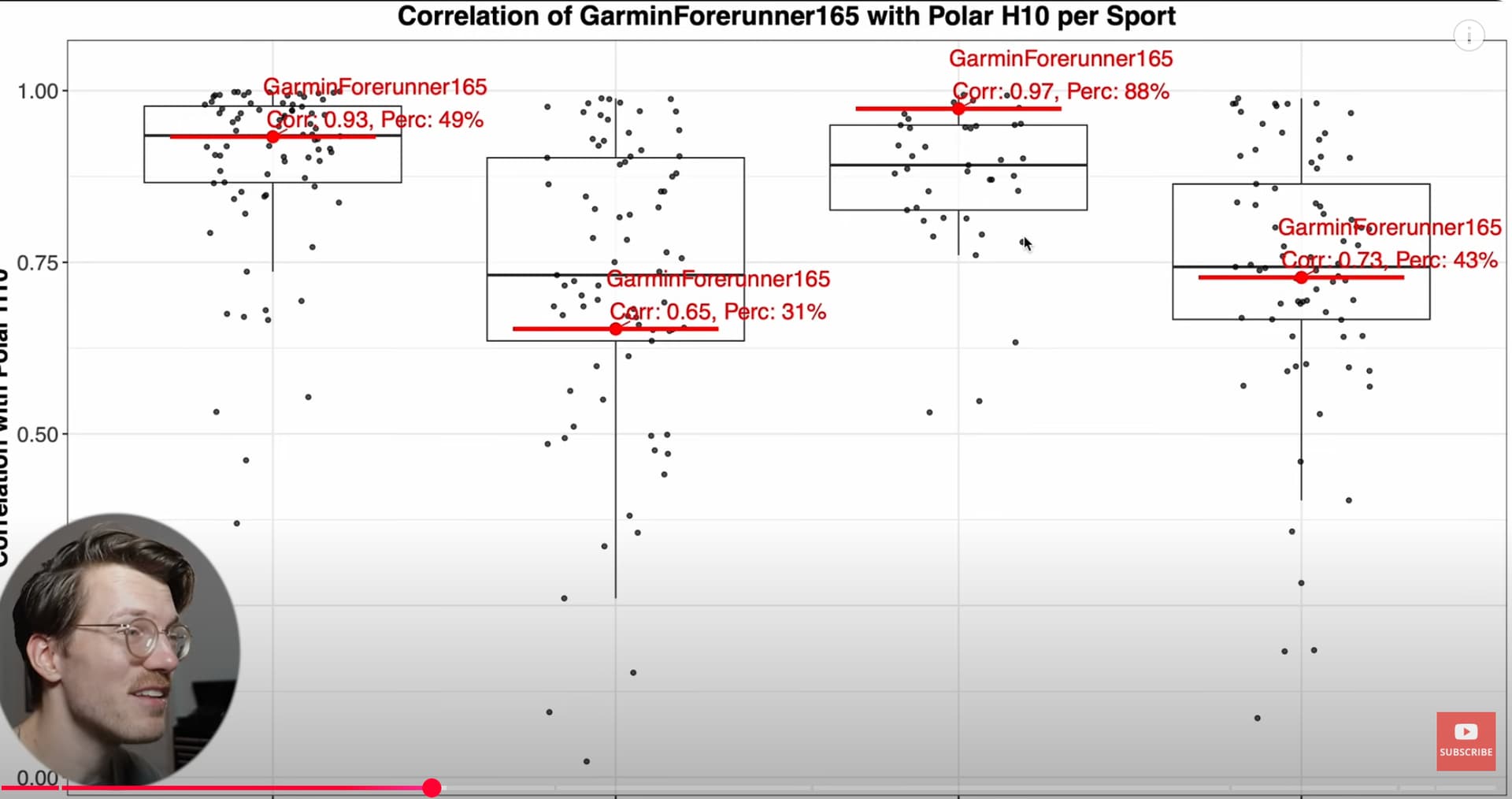 Den optiska mätaren från Garmin korrelerat med ett Polar H10 pulsband nedan. I mina egna tester märker jag störst skillnad under de första löpta kilometrarna. Kollar man på rådatan så får man dessutom betydligt mer pulsdata från ett pulsband jämfört med en optisk mätare i en klocka. Den uppdaterar väldigt frekvent.