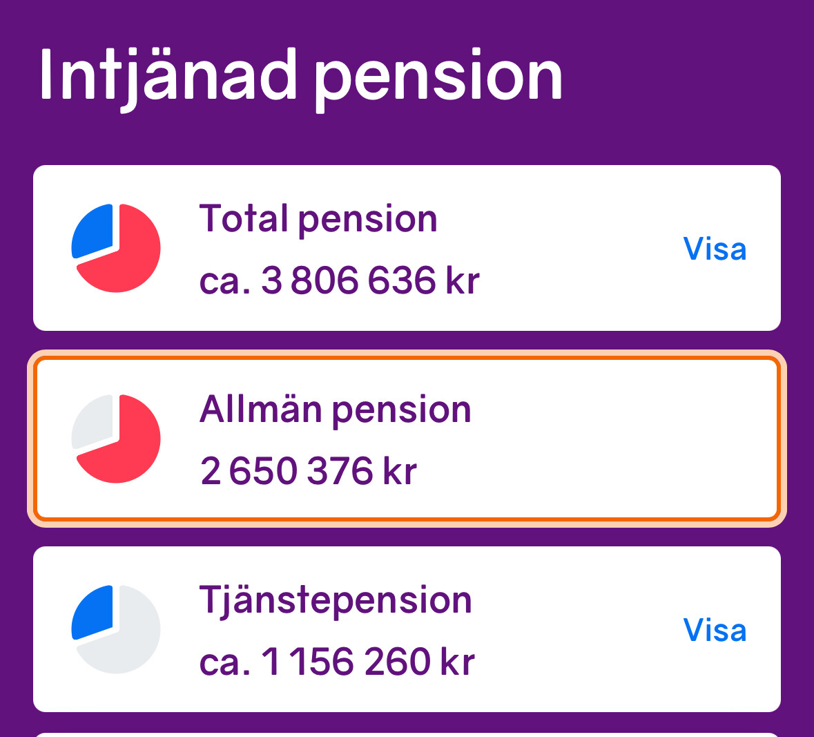 Det finns tydligen en del exempel på där man inte kan se alla delar pension på minpension.se. Jag känner en person som fick 3500 Sek/månad tjänstepension livsvarigt som inte fanns med. Där var det riktigt besvärligt att få koll. Inga årsbesked enligt uppgift heller. När hen ringde den tidigare arbetsgivaren (stor arbetsgivare med tusen++ anställda) och kunde peka på att den skulle finnas via gulnat papper i en pärm kunde dom leta fram aktuella data om den efter lite “fråga kollega”.
