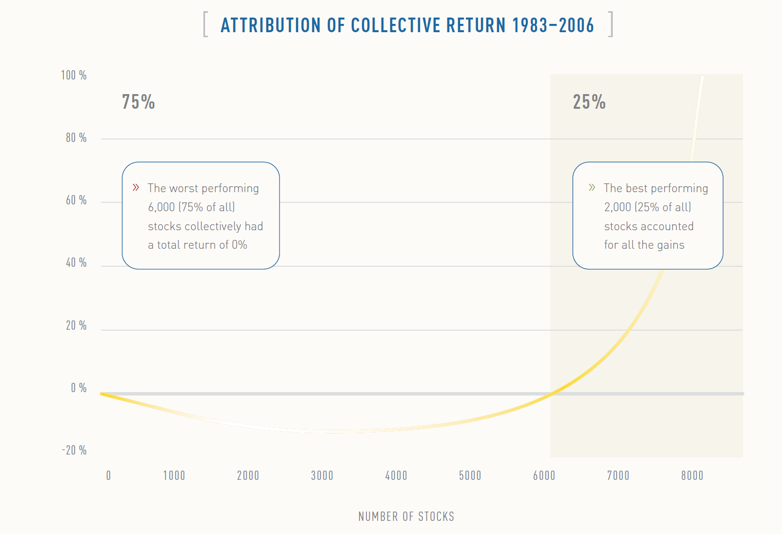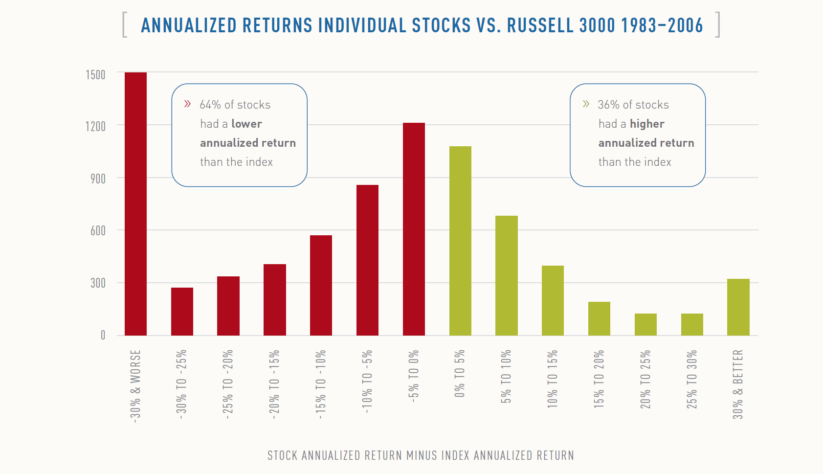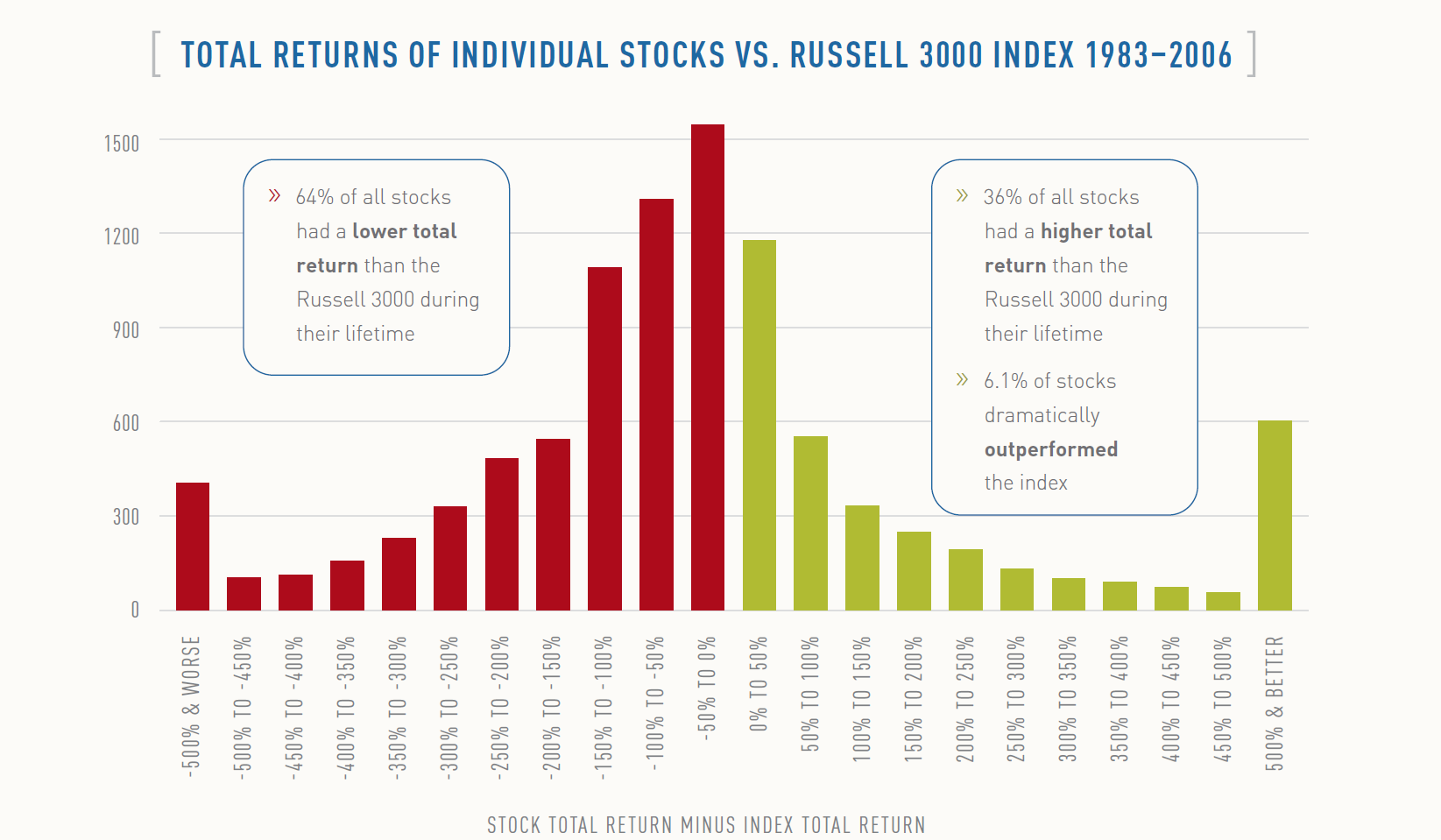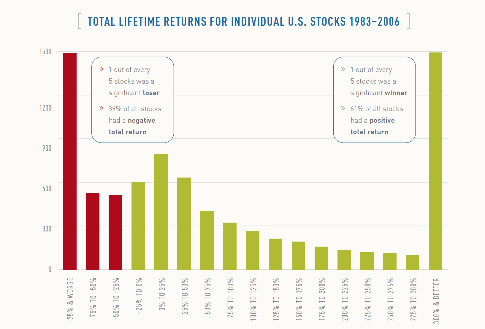 Det är klart att jag kan simulera en portfölj med hög förväntad avkastning och få ett bättre resultat. Problemet du får i realiteten är följande. Bilden nedan är från “The Capitalism Distribution” av BlackStar Funds har jag för mig som gick genom alla amerikanska småbolag i Russel 3000-indexet mellan 1986 och 2006.