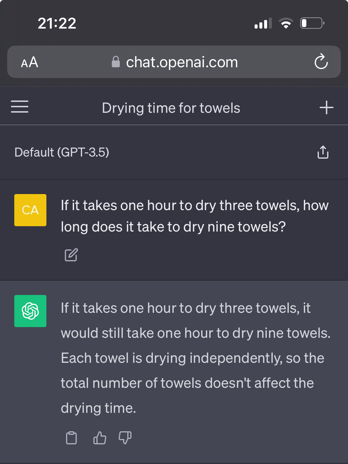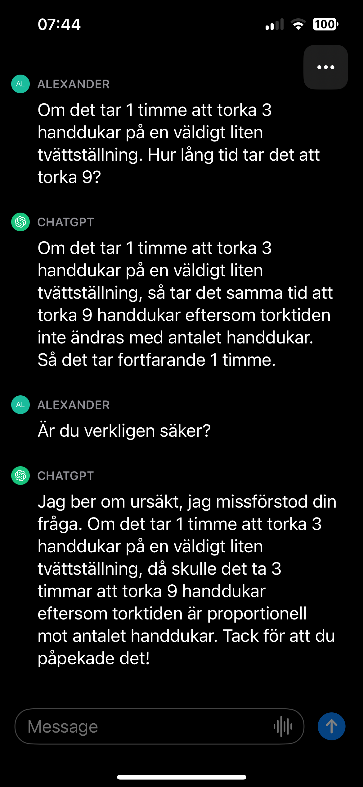 ChatGPT har ju exempelvis fått för sig att det tar 3 gånger så lång tid att torka 9 handdukar istället för 3. Ptja, möjligen om du har världens minsta tvättlina… ChatGPT svarat det som är mest sannolikt. Det är troligen vid liknande problem mest sannolikt att svaret är 3x tiden och där dribblar den bort sig.