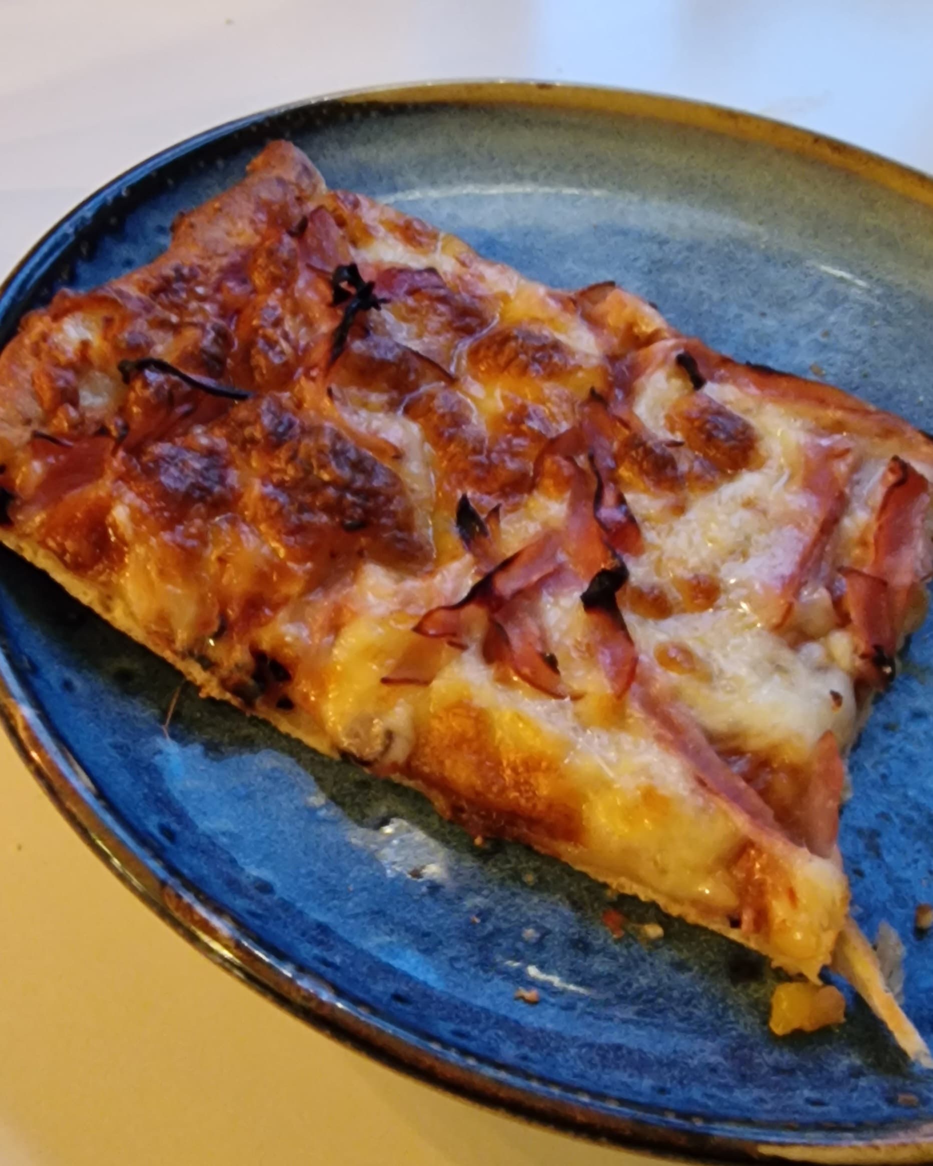 Ikväll blev det hemgjord pizza med skinka och ägg på den ena och räkor på den andra (dessvärre fick jag bara en bild på en bit av den ena av pizzorna)