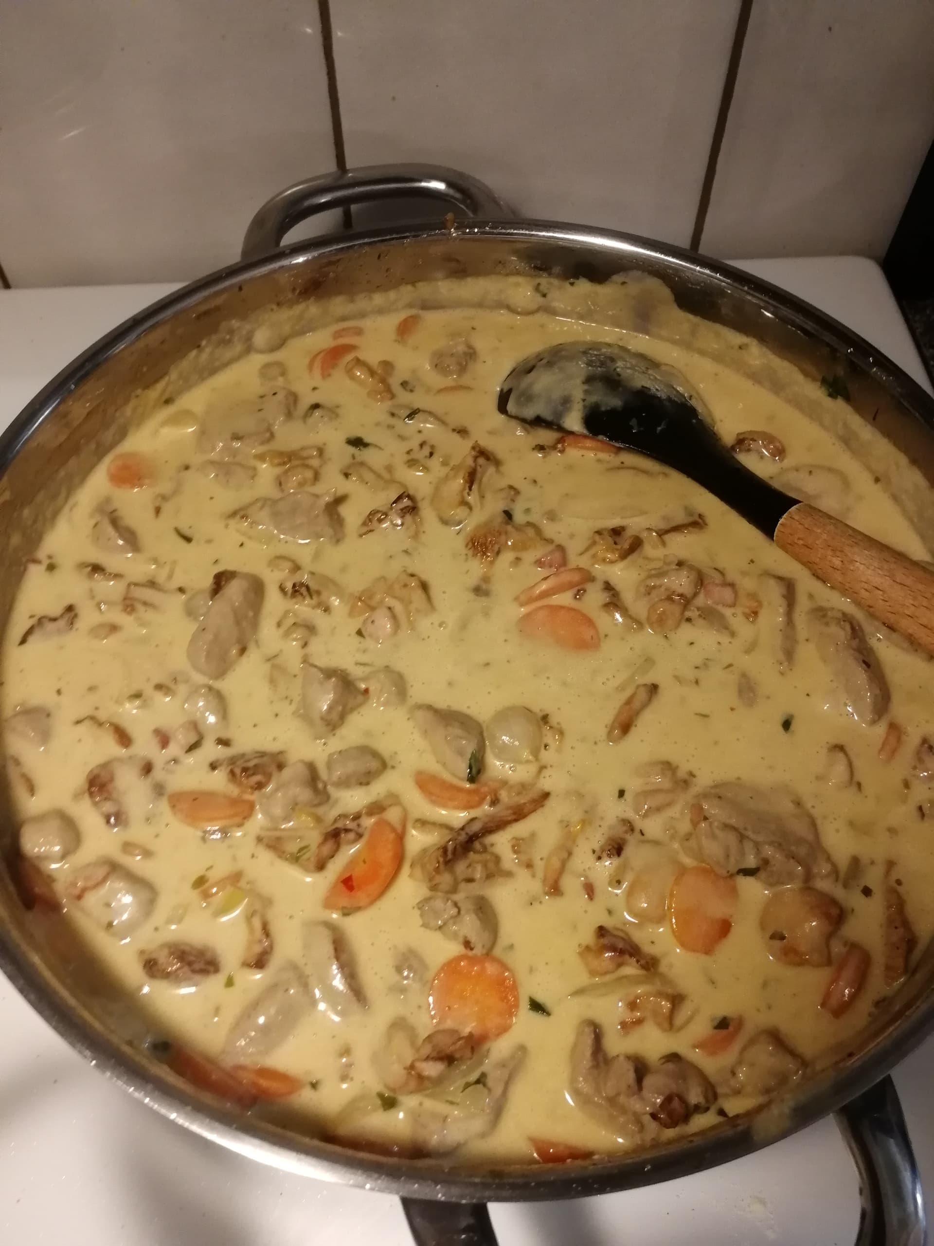 Ikväll blev det stekt kyckling i en sås av svart trumpetsvamp, lök, vitlök, tomatpure, soja, kycklingbuljong, skvätt grädde å en kapsyl whisky. Spagetti till det.