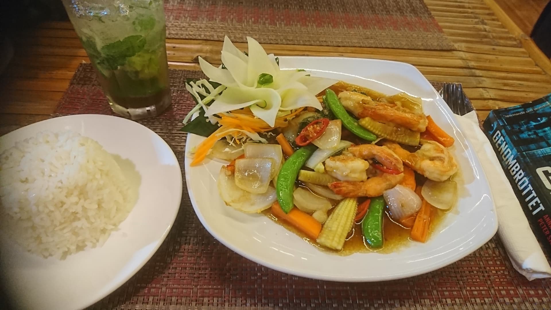 Till middag stir fried grönsaker med räkor och currypasta och mojito. Jag önskade medium, men upplevde inte det som starkt (äter definitivt starkade mat än medelsvensson dock) viss sötma. Fick räkchips med sweetchili som extra innan, sweetchili här var mindre söt och mer chili.