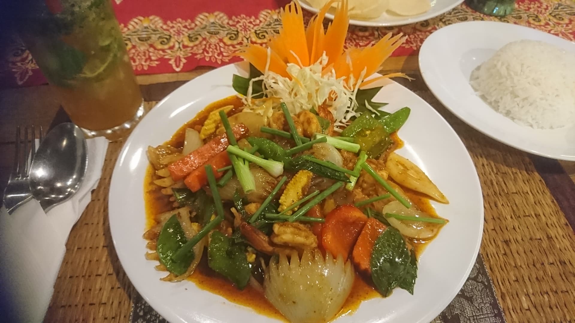 Middag stir fried räkor med basilika och vitlök, a little bit spicy är visst lagom för mig, eller så är det turistanpassat så det skulle bli starkt utanför turistområdet. Mojito. Blommam uppe till vänster var squash på mandolin och uppbyggd av flera bitar, 2 tandpetare och en onödig gummisnodd.