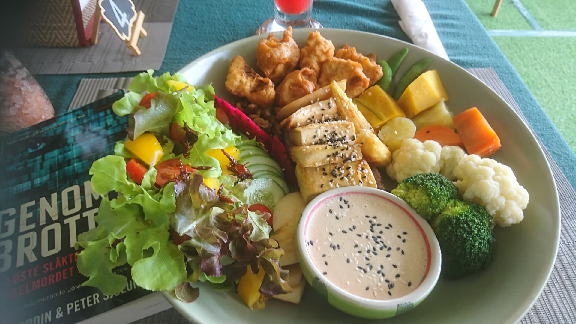 Till lunch buddha bowl med vattenmelonjuice på en vegansk restaurang som hade både en ostmeny och pulled pork på menyn… Lite osäkert vad allt var tofu i mitten, det friterade lite olika, men troligen olika grönsaker och seitan. Grönsakerna till höger lättkokade.