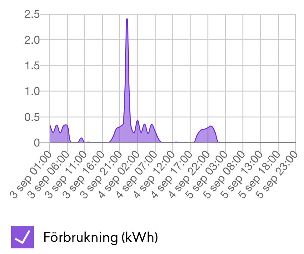 Kolla hur staplarna ser ut i förhållande till samma veckodag förra veckan, vissa dagar har tibber inte hunnit uppdatera timme för timme förbrukningen så då replikeras data från föregående vecka. Uppdateras sedan någon dag wller två senare.