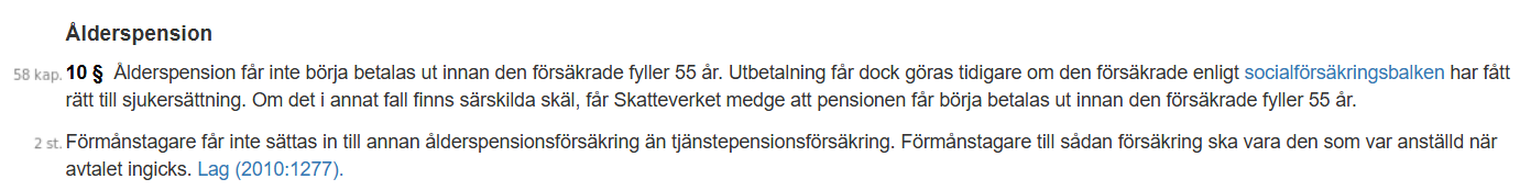 I Sverige verkar vi fortfarande ha 55 år som nedre gräns, men många svenska tjänstepensionsvillkor (har förstås inte läst alla), verkar följa en standardmall som säger typ ”55 års ålder dock tidigast den tidpunkt som anges inkomstskattelagen”. Så än så länge är just den faktorn mer fördelaktig i Sverige. Om detta kommer att ändras i framtiden är förstås svårt att sia om, men det är väl inte omöjligt då det kan finnas bra skäl för det från ett nationalekonomiskt perspektiv.