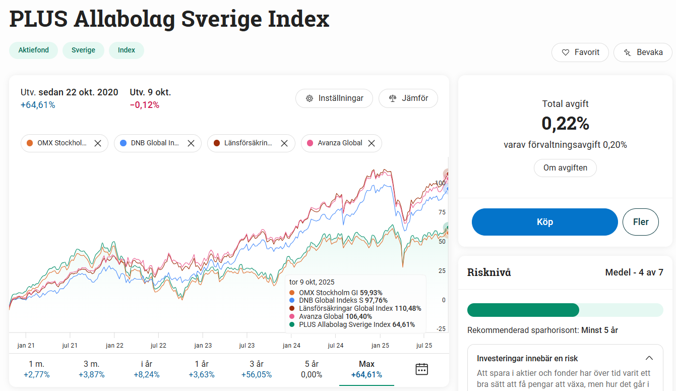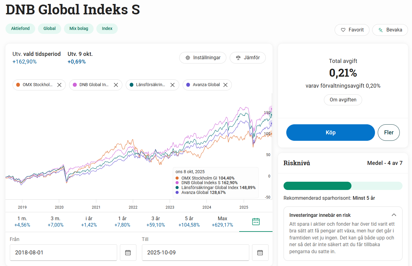 Tillägg: Jag ser nu att Avanza Global bara har ca. halva avgiften mot DNB. Om de f.ö. har ett exakt likadant aktieinnehav så borde Avanza-fonden ge bättre avkastning, men det har den ju bevisligen inte gjort om man jämför den tidsperiod det finns data för den. Så man kan fråga sig vad det är som skiljer fonderna. Jag är inte tillräckligt insatt, men det finns gott om trådar att nörda in sig på om man vill jämföra globalfonder.