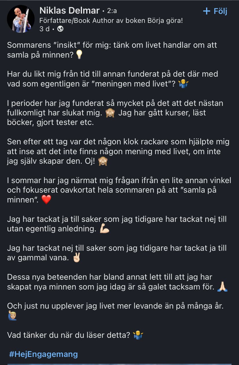 Skapa minnen är inget jag har fokus på alls, det känns väldigt prestationsinriktat. Mer att leva i nuet och ha lite planer i miniatyr för närmaste tiden framåt, stort eller smått. Eller bara ta dagen som den kommer. Minnena kommer ändå och det kan vara väldigt “små” saker som man uppskattar senare, det behöver inte vara safari i Afrika eller något annat klassiskt som “andra” tycks söka sig till. Ärligt talat bryr jag mig inte ett skvatt om vad andra rankar som viktigt att uppleva, jag vet vad jag behöver, eller kan uppskatta ändå.