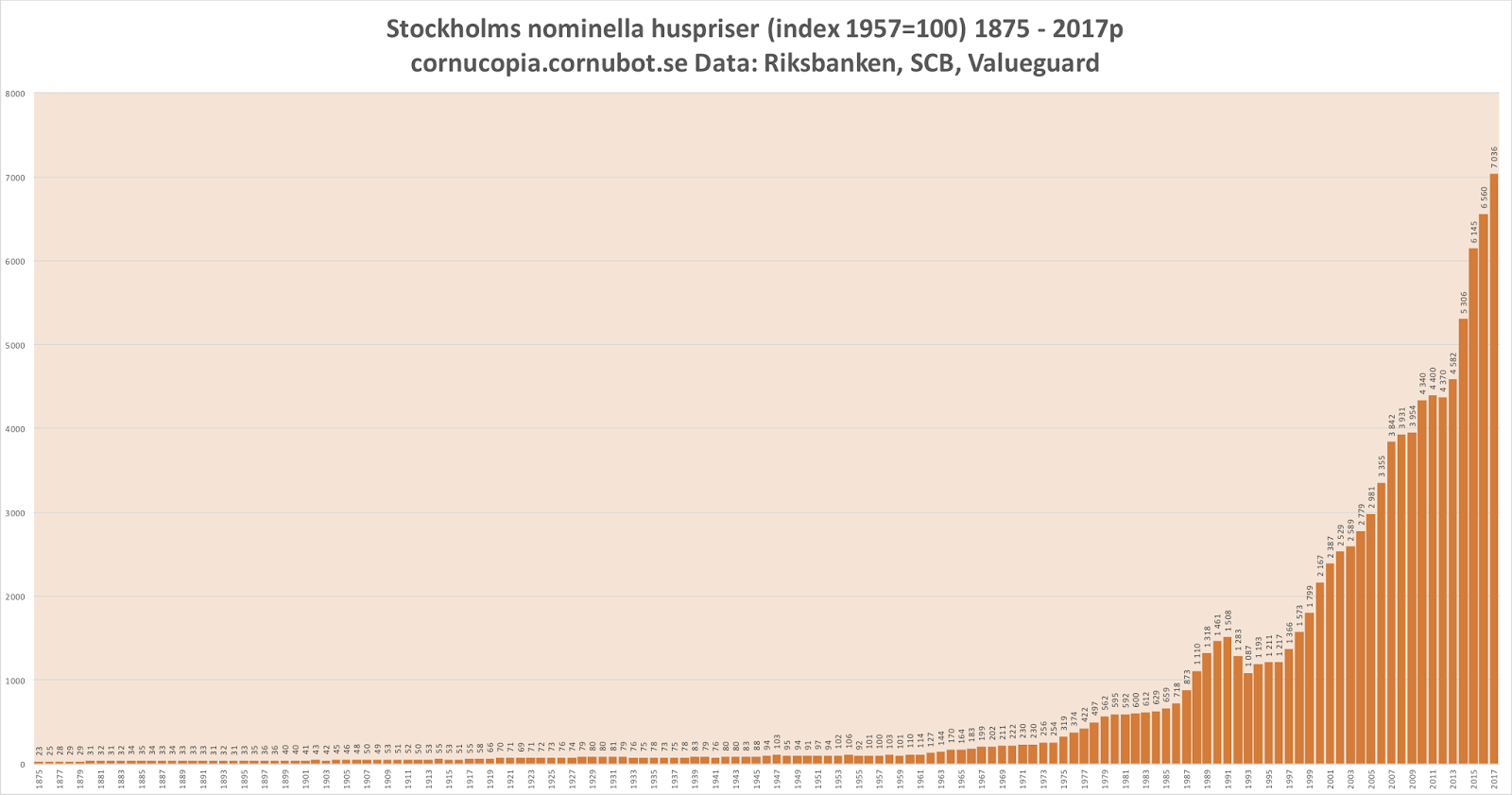 På 90-talet gick huspriserna som aggregat (index) i Stockholm ner ungefär 28% procent från topp till botten. “Allmän” i det här fallet är som tidigare nämnt alltså att “alla” bostäder sjunker i värde, inte att det inte kan vara ett stort fall.