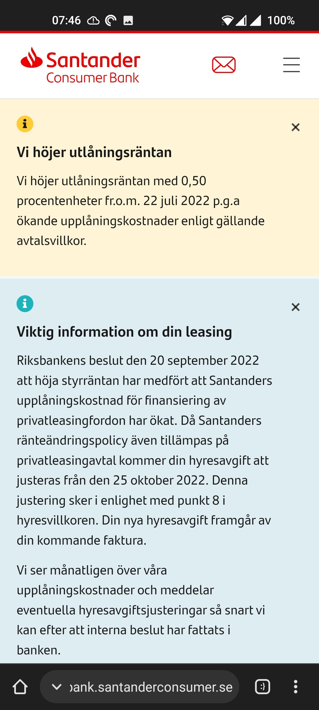 Min leasingavgift höjdes också nu under sommaren från 3800 till 4000/månad. Har en MG. Och ingen som helst möjlighet att dubbelkolla hur mycket deras ränta höjts… Stod både i kontraktet för denna, och min förra (Audi), så antar att jag får skylla mig själv.
