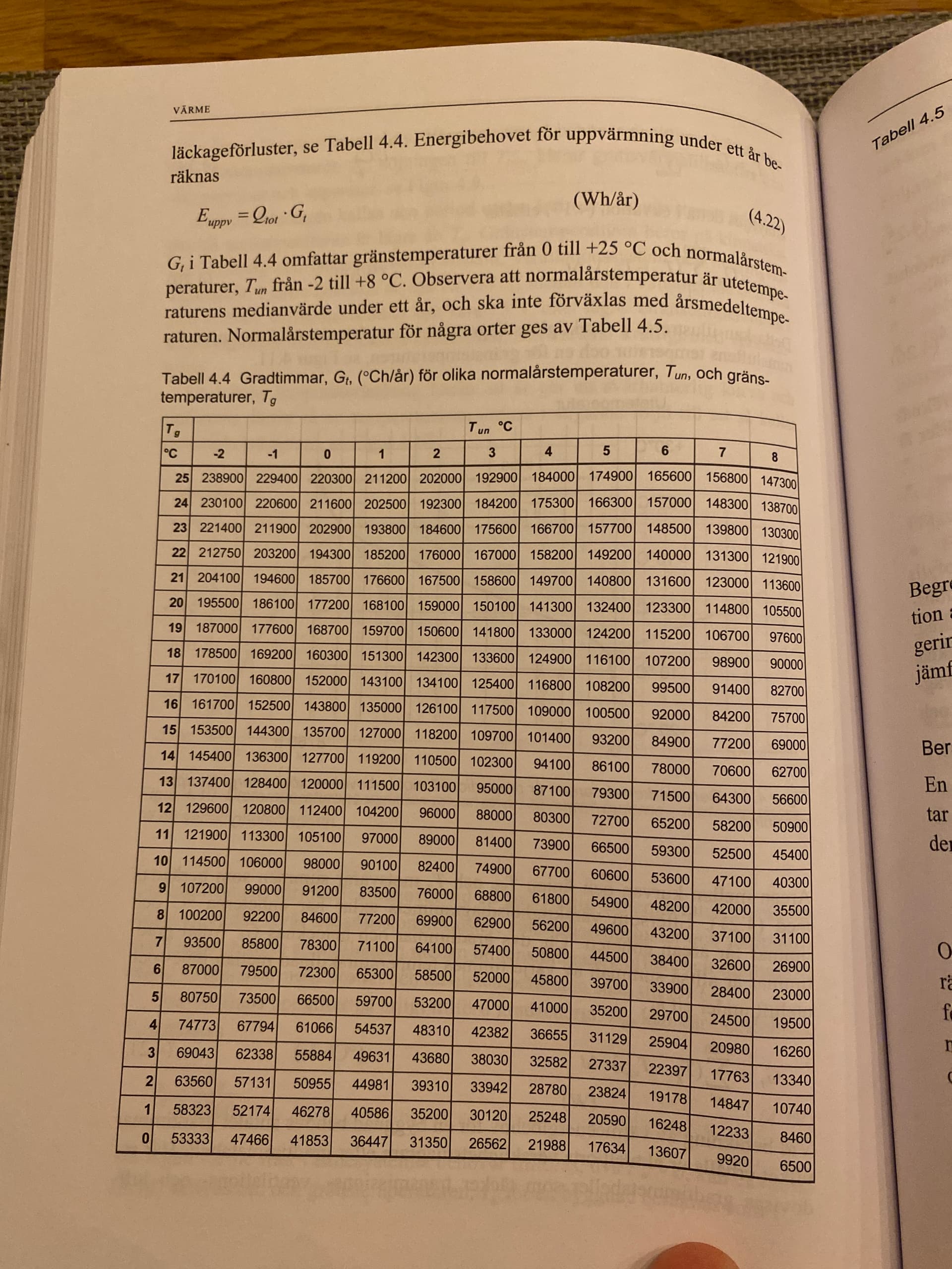 Ungefär så! Det man brukar prata om är gradtimmar. Vilket rent krasst är grader*timmar där temperaturen är under normalårstemperaturen på orten. Se bild för några exempel. Till vänster ”grader C” ser man hur gradtimmarna påverkas per grad. I Stockholm är normalårstemperaturen 6.6 men då kan du se att karesuando ligger på -1.6 som normalårstemp och har ca 165.000 gradtimmar med gränstemperatur (vid vilken temperatur vi måste börja värma kåken) 17c. Och i Stockholm hamnar vi på ca 87.000. Sen kan du läsa ut antalet gradtimmar och hur de ändras beroende på hur du ändrar gränstemperaturen. Så minskar du en grad blir det 16c istället för 17c och kan då läsa ut hur många gradtimmar du sparar. Med detta ser vi att besparingen är mindre per grad i Norrland för att det är kallt som fan hela tiden