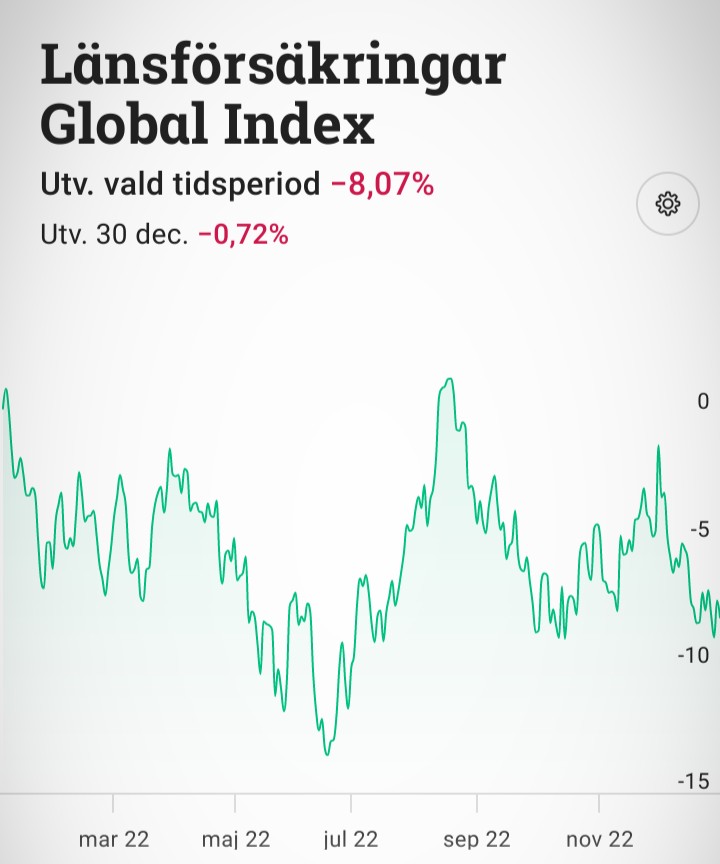 Missade på LF Global (trodde -20 till -30) då jag inte trodde SEK skulle vara så svag så länge, men åtminstone stolpe in på själva indexet (utan valuta) mätt som tex DJ World. Alltid någon tröst.