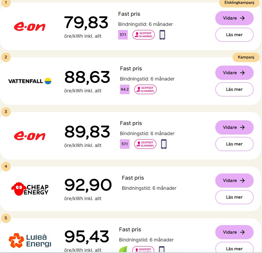 Gallrar jag bort elbolag “på klagomålslistan” så ser det ut så här på elskling.se just nu om jag tar ett postnummer i Sundsvall =elområde 2.
