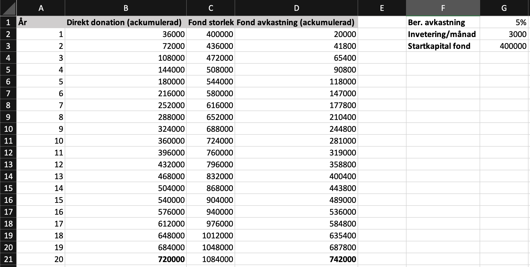 Visar en snabb uppställning i Excel att efter ca 20 år är den ackumulerade summan man donerat samma, samtidigt som kapitalet på fonden ökat. Det skulle dessutom bara ta 10 år tills den årliga donationssumman överstiger den vid direkt donation.