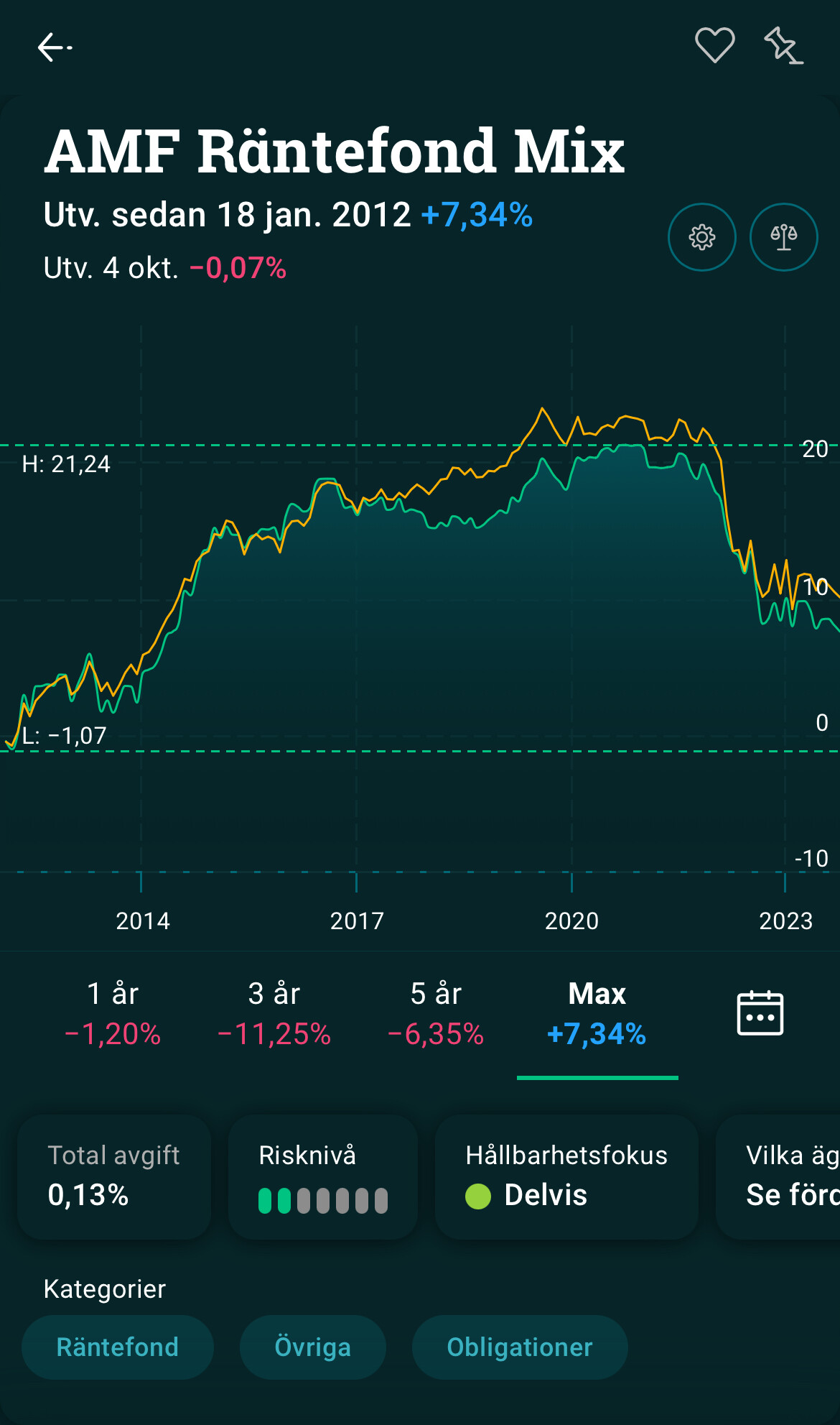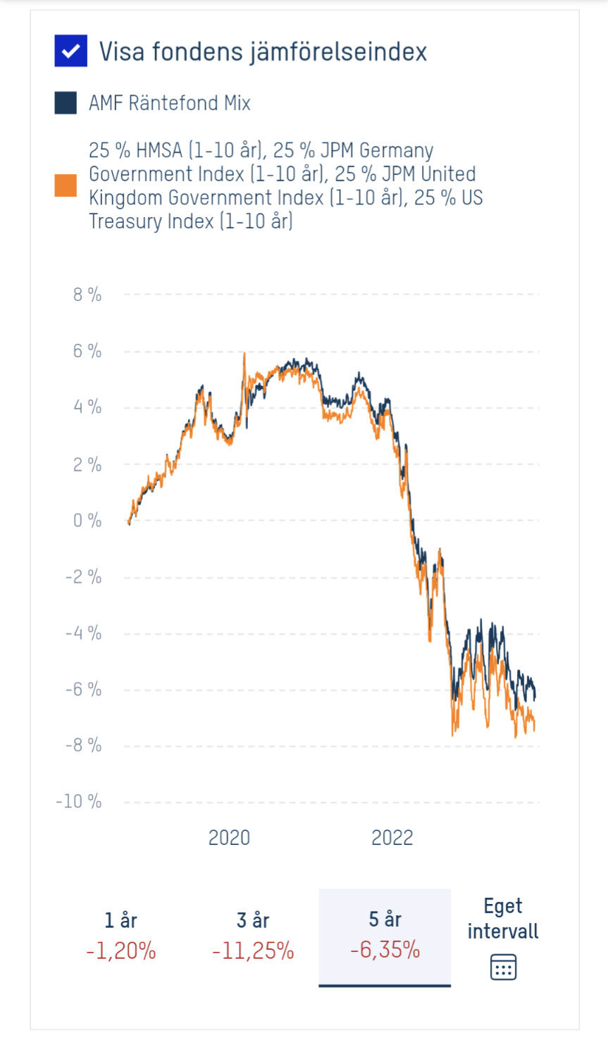 AMF räntefond mix har varit: +7.63% sedan 2012 eller en CAGR på 0.67%. Samtidigt har bankräntorna som lägst varit runt 1-2%.