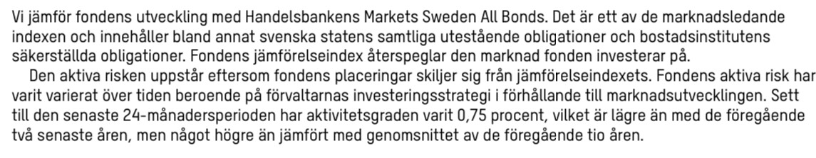 Fondens jämförelseindex består, sedan 1 dec 2014, av 25 % HMSA, 1-10 år (Handelsbanken Markets Sweden All Government Bonds),
